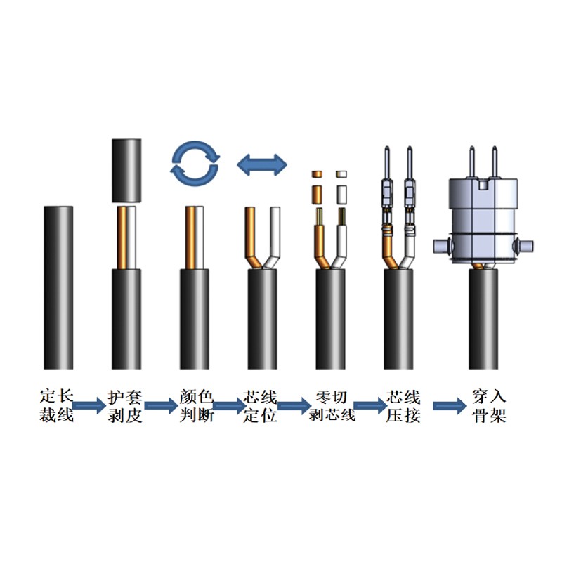 本設備適用于雙芯線線束進行主動送線、線束校直、定長裁切、切剝外皮、芯線顏色分辨、剝芯線、端子壓接、壓接檢測、穿塑殼工作。